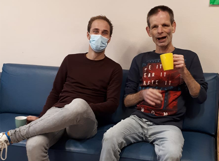 Daarnet heb je met Stefan een heel eind gewandeld, dat had hij echt even nodig! Nu hij zijn spanning wat kwijt is gaat hij aan een tafel zitten om te puzzelen. Daarbij houdt hij jou in de gaten, jij bent zijn vaste baken en geeft hem veiligheid. Ondertussen zoekt Carlos jouw aandacht, “koffie, lekkere koffie!”, daarmee wil hij even checken of het al koffietijd is, zodat hij weet op welk moment van de dag hij zit en of alles nog wel klopt. Jij weet, wanneer je hem die duidelijkheid niet geeft, hij heel dwingend kan worden in het vragen om koffie en hij zichzelf daarin kan verliezen. Dus zeg je: ‘Nog één puzzel maken, en dan is er koffie!’ Je ziet hem ontspannen aan een tafel gaan zitten.