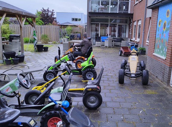 Je baant je een weg door alle skelters die in de tuin staan om te kijken wie er zin heeft om op deze mooie dag nog even een ommetje te maken. Het samen gekookte avondeten is op, degene die corvee heeft en de afwasmachine in moest ruimen heb je geholpen en nu is het tijd om even de benen te strekken! Een aantal bewoners gaat skelteren in de aangrenzende omheinde tuin, een aantal loopt graag een rondje door de woonwijk met je mee.