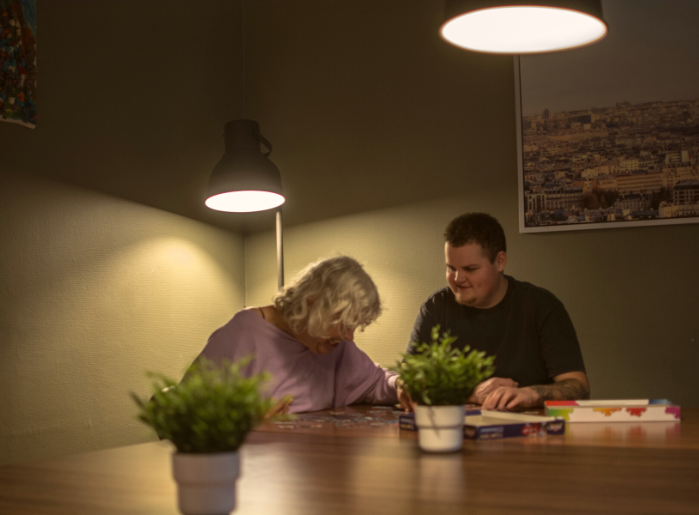 Op Hartenkoning 14, op woonpark 's Koonings Jaght wonen 12 mensen met een Ernstige Verstandelijke Beperking. De woning bestaat uit twee delen: aan elke kant zijn er zes kamers en is er een gezamenlijke woonkamer. Op de woning doen we ons best om een gezellige en huiselijke sfeer te creëeren. We maken geregeld tijd voor uitstapjes, elk weekend staat er wel een bezoek aan bijvoorbeeld een pannenkoekrestaurant of nabijgelegen Van der Valk restaurant op het programma. Of ‘s avonds een rugzak inpakken met koffie/thee en bekers en hup de hei op! Alle bewoners zijn mobiel, er is geen intensieve ADL zorgvraag.